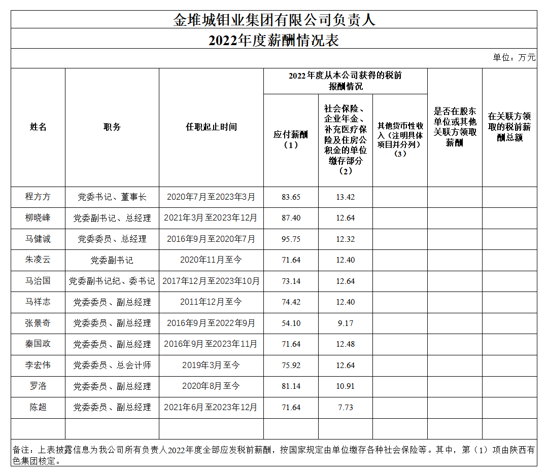 金堆城钼业集团有限公司负责人2022年度薪酬情况表