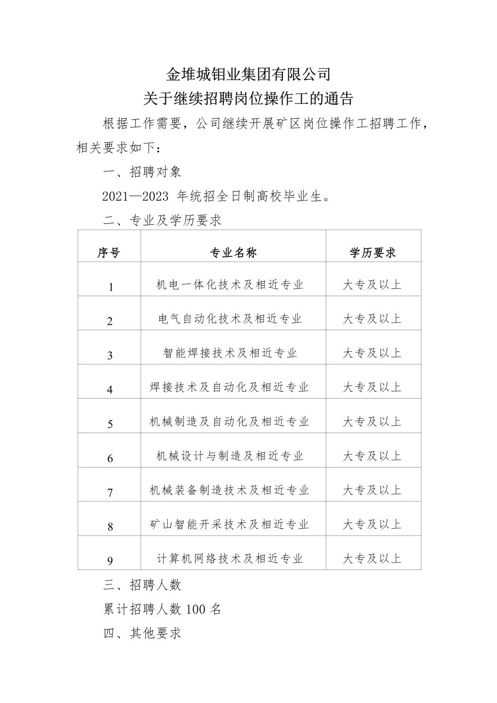 金堆城钼业集团有限公司关于继续招聘岗位操作工的通告