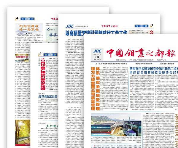 《中国钼业之都报》属企业内部刊物,创刊于1973年11月22日,刊号为“陕新出内印字第9905号”,最早名为《战报》、《金堆矿报》报等,2007年更名为《中国钼业之都报》并沿用至今,创刊50年来已刊发近2000期。报纸为周报,有公司要闻、综合新闻、专题、文艺副刊四个版面,每周一出报,并在ty8天游平台登录融媒、微信公众号等平台以电子报推出。创刊以来,报纸坚持以“服务企业发展、关注钼都焦点、讲好身边故事、凝聚发展合力”为宗旨,积极发挥信息传播的桥梁纽带作用,围绕企业生产经营中心工作,唱响主旋律,打好主动仗,不断提高舆论引导水平和新闻宣传质量,是ty8天游平台登录集团宣传思想文化建设的一个重要阵地。